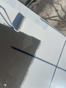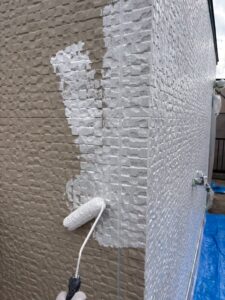 その後、外壁には下塗りを行い、仕上げ塗料の密着性と耐久性を高めました。あわせてサッシや開口部には養生を施し、周囲を保護しながら安全かつ丁寧に作業を進めています。