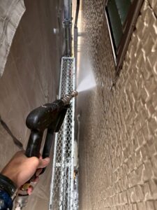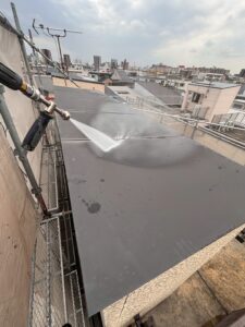 工事はまず、高圧洗浄による下地処理から開始しました。外壁や屋上に付着した汚れ・カビ・古い塗膜を丁寧に洗い流し、新しい塗料や防水材がしっかり密着する状態を整えます。