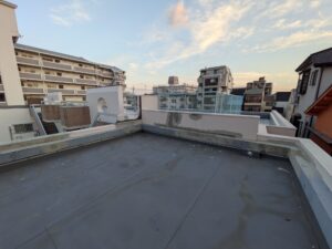 防水工事を行い、劣化していた防水層や排水口周辺をしっかりと補修しました。屋上全体の防水性能が回復し、雨水の侵入を防ぐ安全な状態になっています。定期的な点検とメンテナンスを行うことで、建物を長く守ることができます。