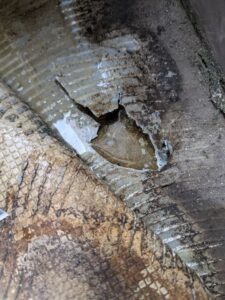 現地調査では、防水層の一部に膨れが発生しており、防水シート内部に湿気や水分が入り込んでいる可能性がありました。また、排水口周辺では防水層の破れが見られ、雨水が直接下地に侵入する恐れがある状態でした。