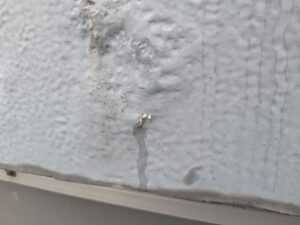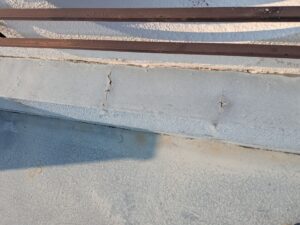 さらに、屋上の立ち上がり部分には細かなひび割れが発生しており、防水層の継ぎ目部分から水が入り込むリスクも確認されました。屋上防水では、この立ち上がり部分や排水口周辺が特に雨漏りの原因になりやすいため、重点的な補修や防水処理が重要になります。