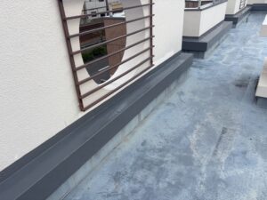 屋上だけでなく、階段横にある排水溝部分でも防水処理を行いました。排水溝周辺は雨水が集中しやすく、防水層が劣化すると水が溜まりやすくなるため、雨漏りの原因になることがあります。防水材でしっかりと補修を行うことで、水の侵入を防ぎ、排水機能を正常な状態に改善しました。